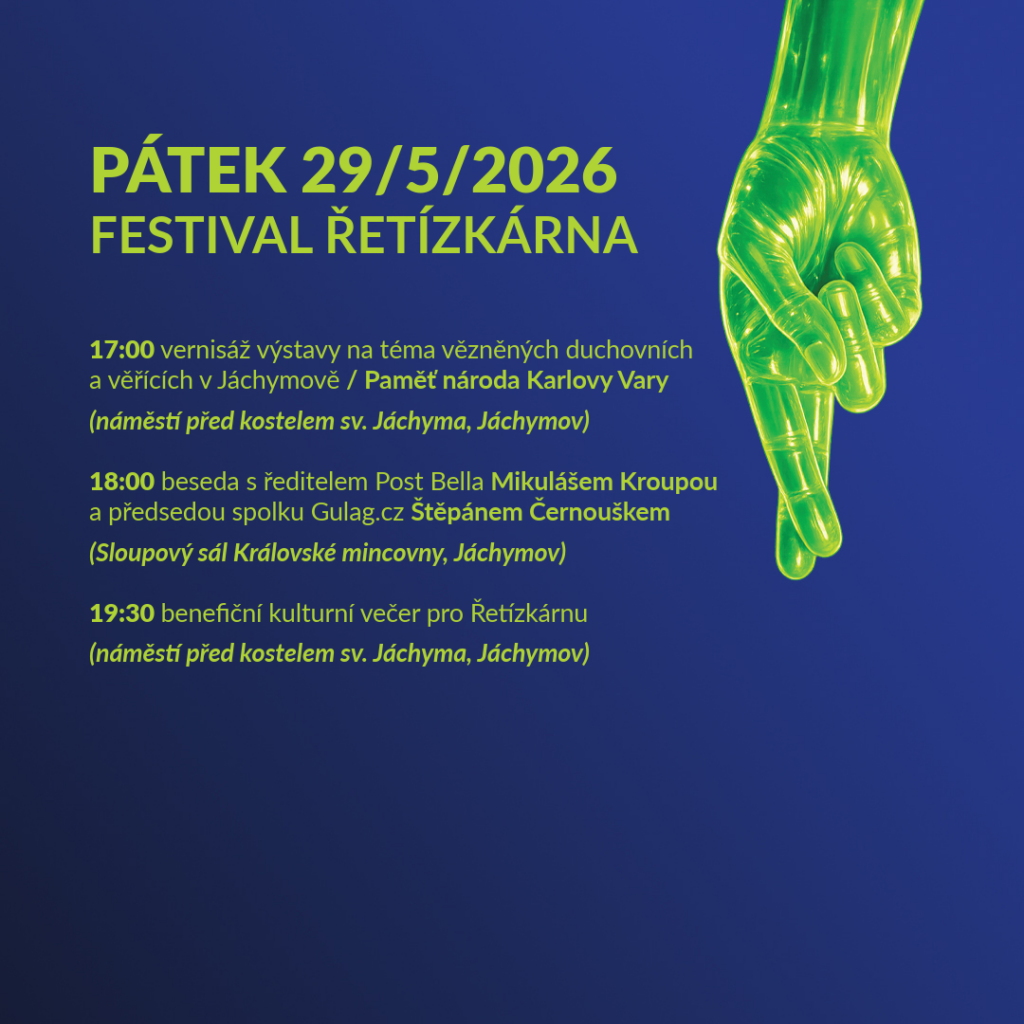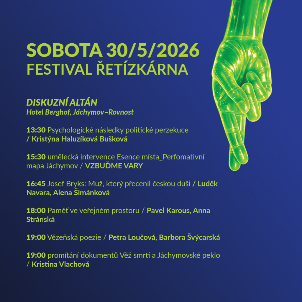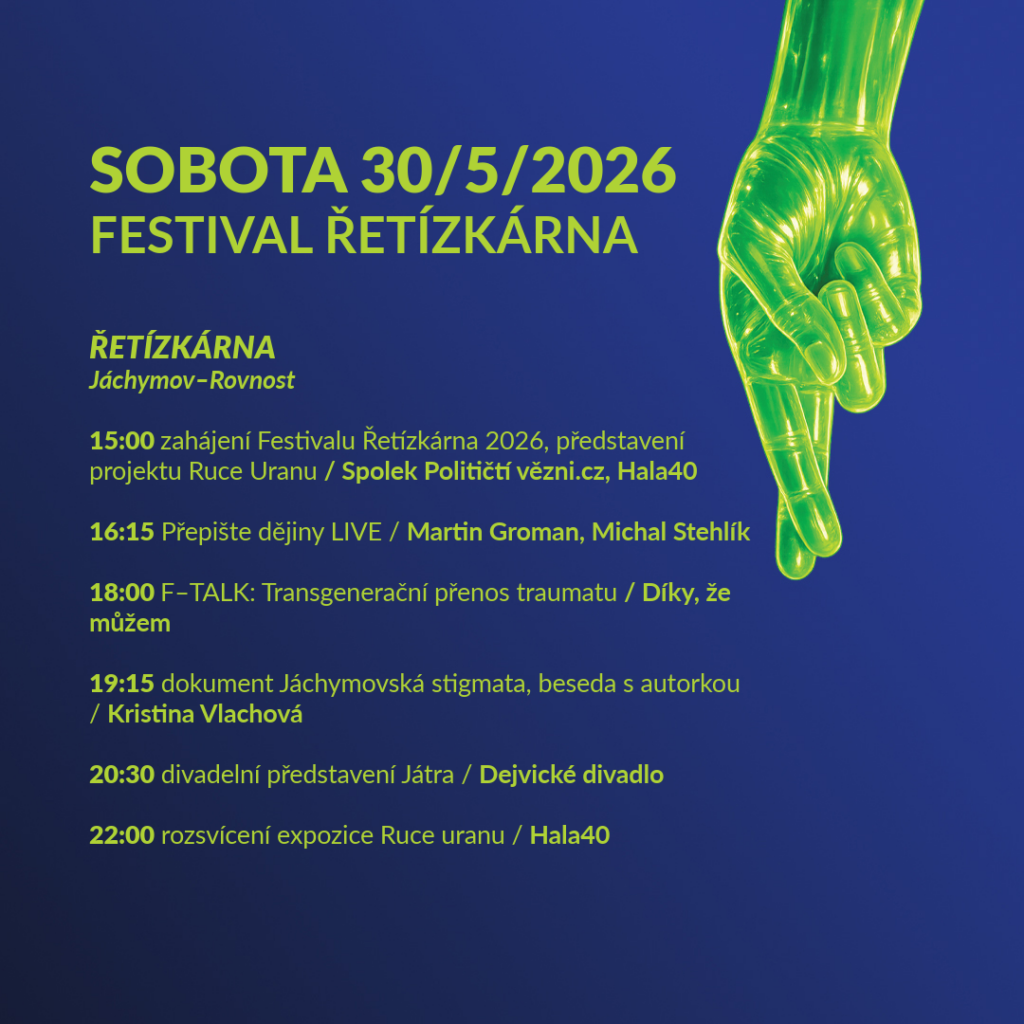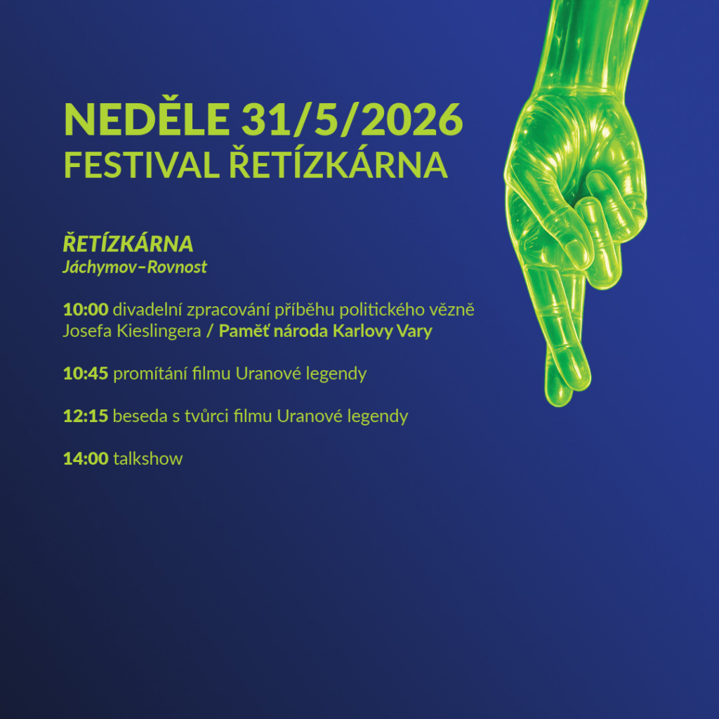 Festival Řetízkárna 2026 bude! Zapište si termín 29.–31. 5. 2026 a buďte u toho s námi. Těšit se můžete na Dejvické divadlo, podcast Přepište dějiny live, debatu Díky, že můžem, pietní akt Jáchymovské peklo, promítání dokumentů Kristiny Vlachové, program ve spolupráci s Pamětí národa, vernisáž výstavy Josef Bryks: Muž, který přecenil českou duši, představení projektu Ruce uranu, projekt Esence místa spolku VZBUĎME VARYtematické diskuzekomentované procházkykrušnohorský market a mnohé další. Sledujte naše komunikační kanály, ať vám nic neunikne.