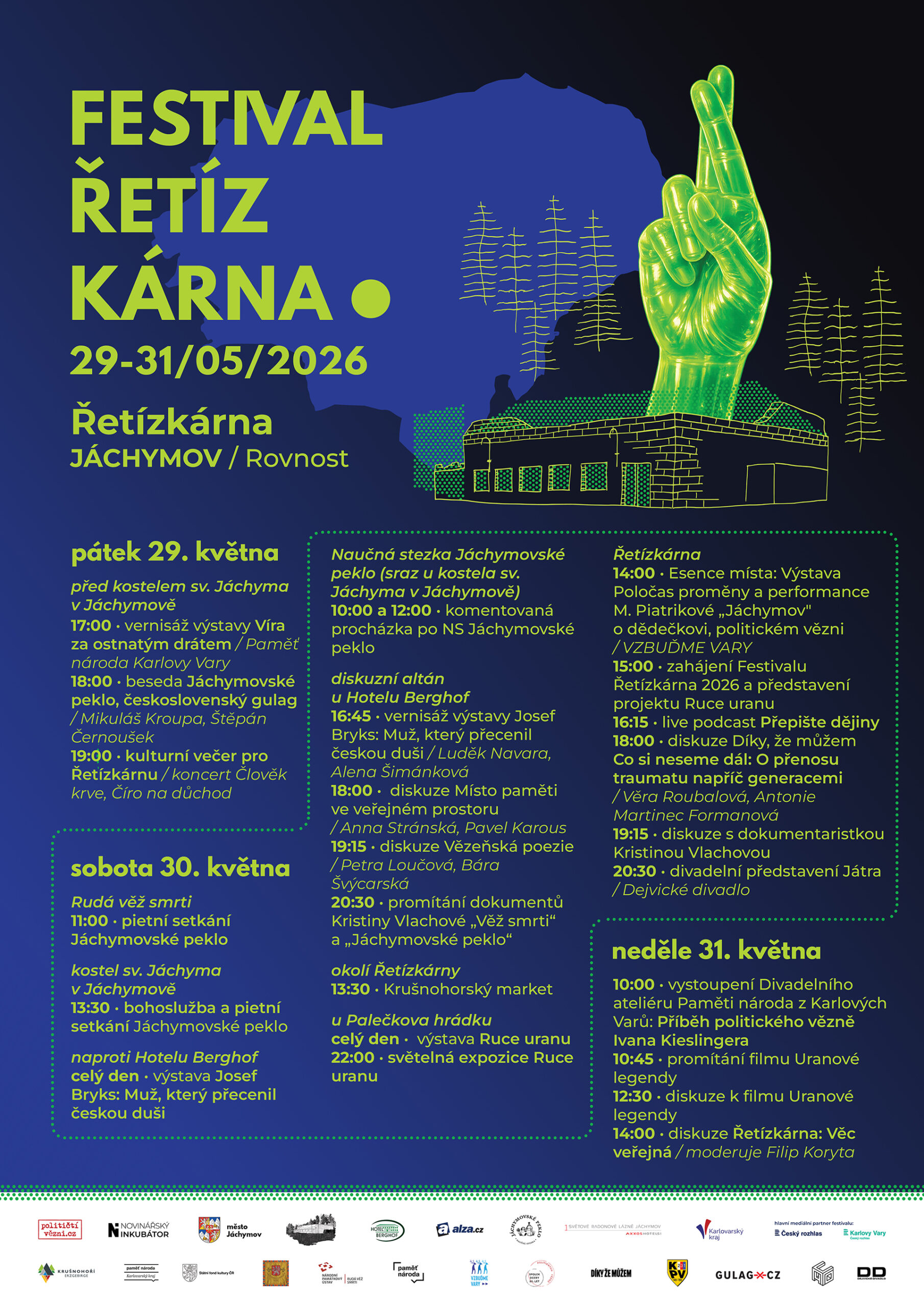 Festival Řetízkárna 2026 bude! Zapište si termín 29.–31. května 2026 a buďte u toho s námi. Těšit se můžete na Dejvické divadlo, podcast Přepište dějiny live, debatu Díky, že můžem, pietní akt Jáchymovské peklo, promítání dokumentů Kristiny Vlachové, program ve spolupráci s Pamětí národa, vernisáž výstavy Josef Bryks: Muž, který přecenil českou duši, představení projektu Ruce uranu, projekt Esence místa spolku VZBUĎME VARY, tematické diskuze, komentované procházky, krušnohorský market a mnohé další.